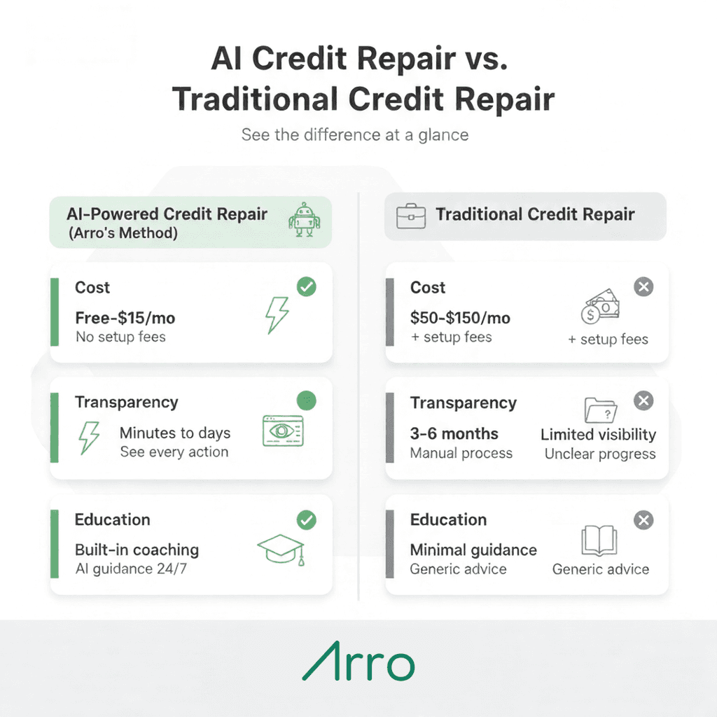 Unlike credit builder brands that focus solely on disputes or secured cards that require deposits you may not have, Arro offers a complete credit-building ecosystem accessible to everyone.