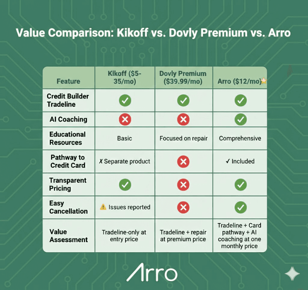 Kikoff costs less ($5/mo) because it's tradeline-only—no coaching, no card pathway, no advanced education. Dovly costs more ($39.99/mo) because they focus on credit repair with dispute services.