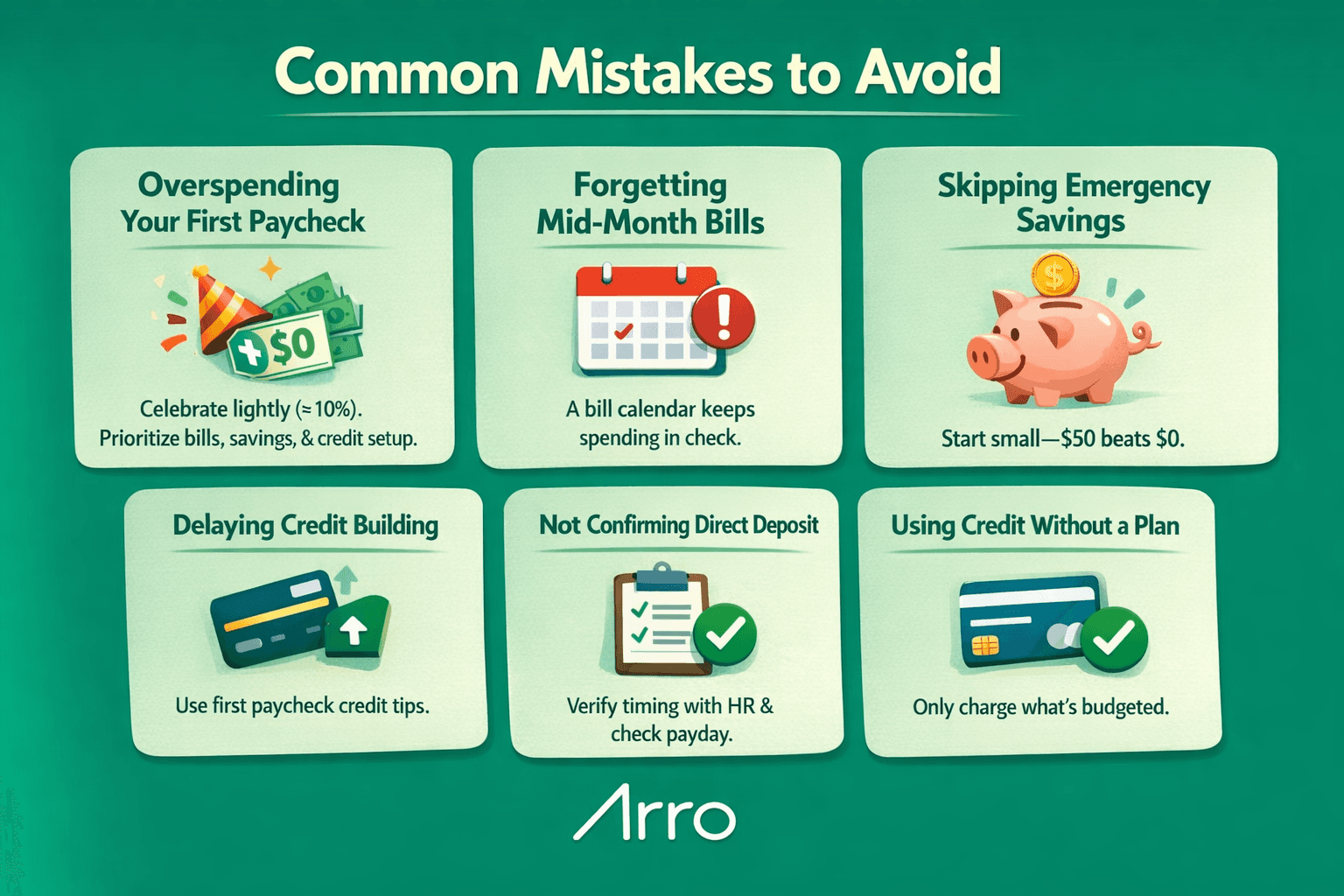 Mistake #4: Waiting to Build Credit - Apply first paycheck credit tips immediately. Products like Arro include educational resources that teach as you build.