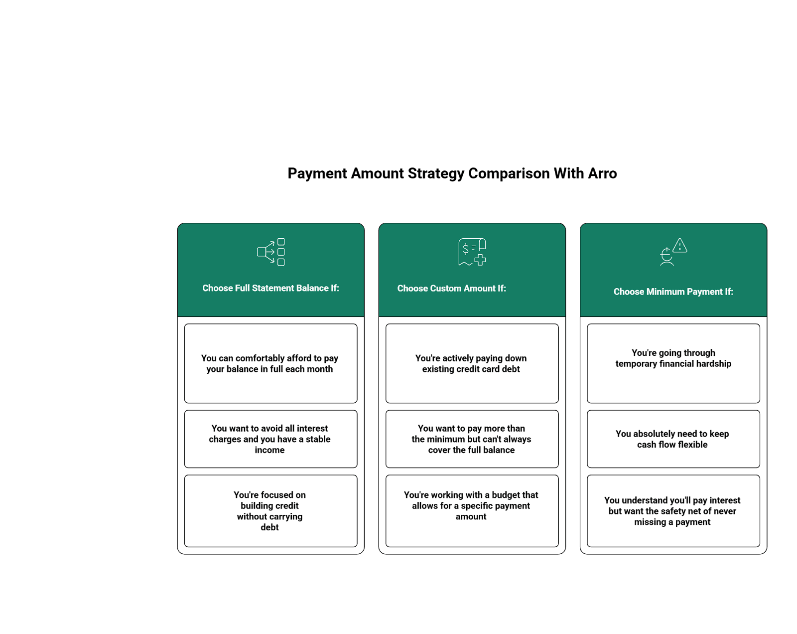 Custom Amount: Pays a specific dollar amount you choose, which is proper if you want to pay more than the minimum but can't always cover the full balance.