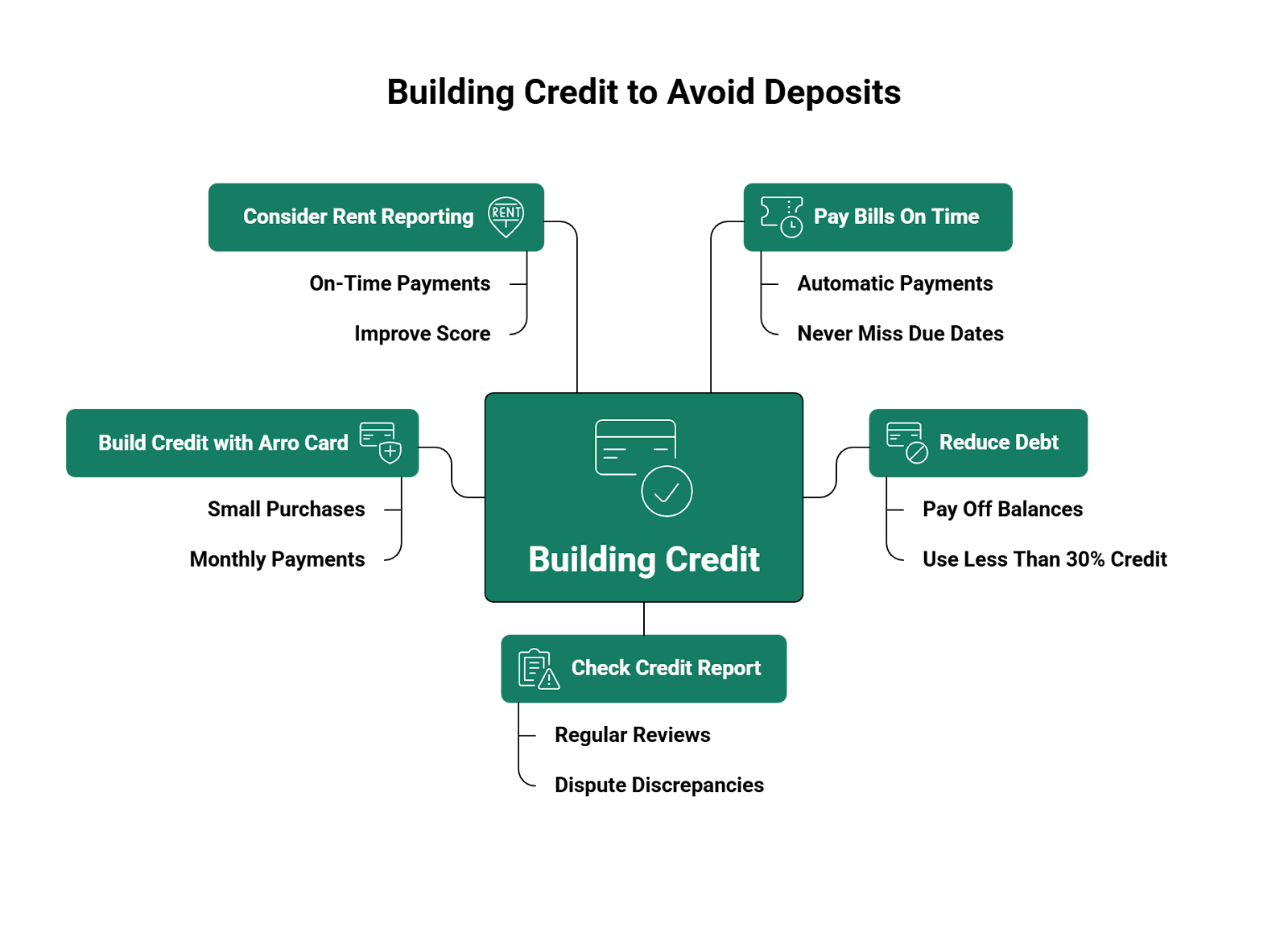 Following these steps consistently will help you build your credit over time and avoid the extra burden of large deposits.
